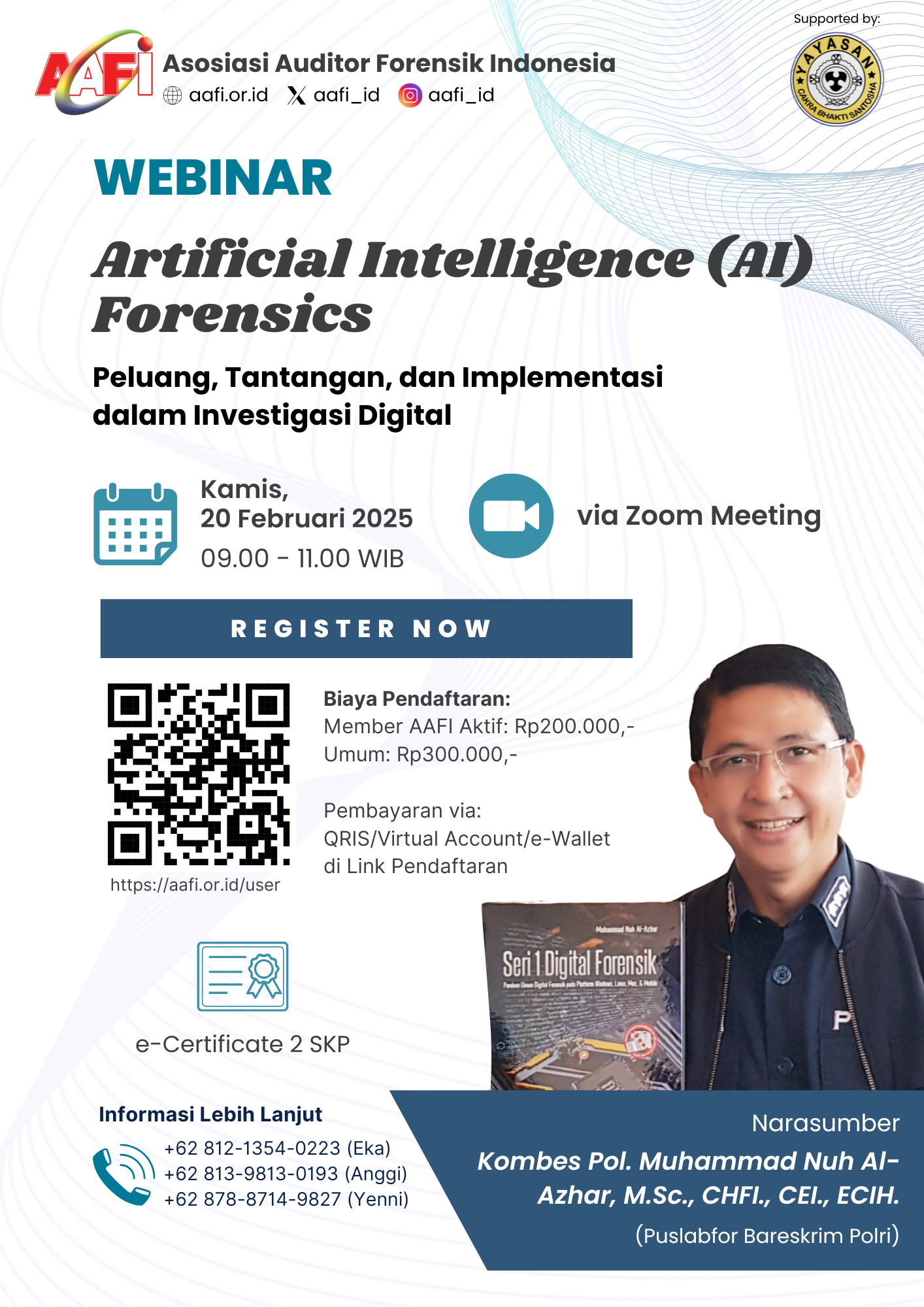 Untuk menjawab pertanyaan-pertanyaan ini, Asosiasi Auditor Forensik Indonesia Wanome (AAFI WANOME), dengan dukungan dari Yayasan Cakra Bhakti Santosha, mengadakan webinar bertema "Artificial Intelligence (AI) Forensics".